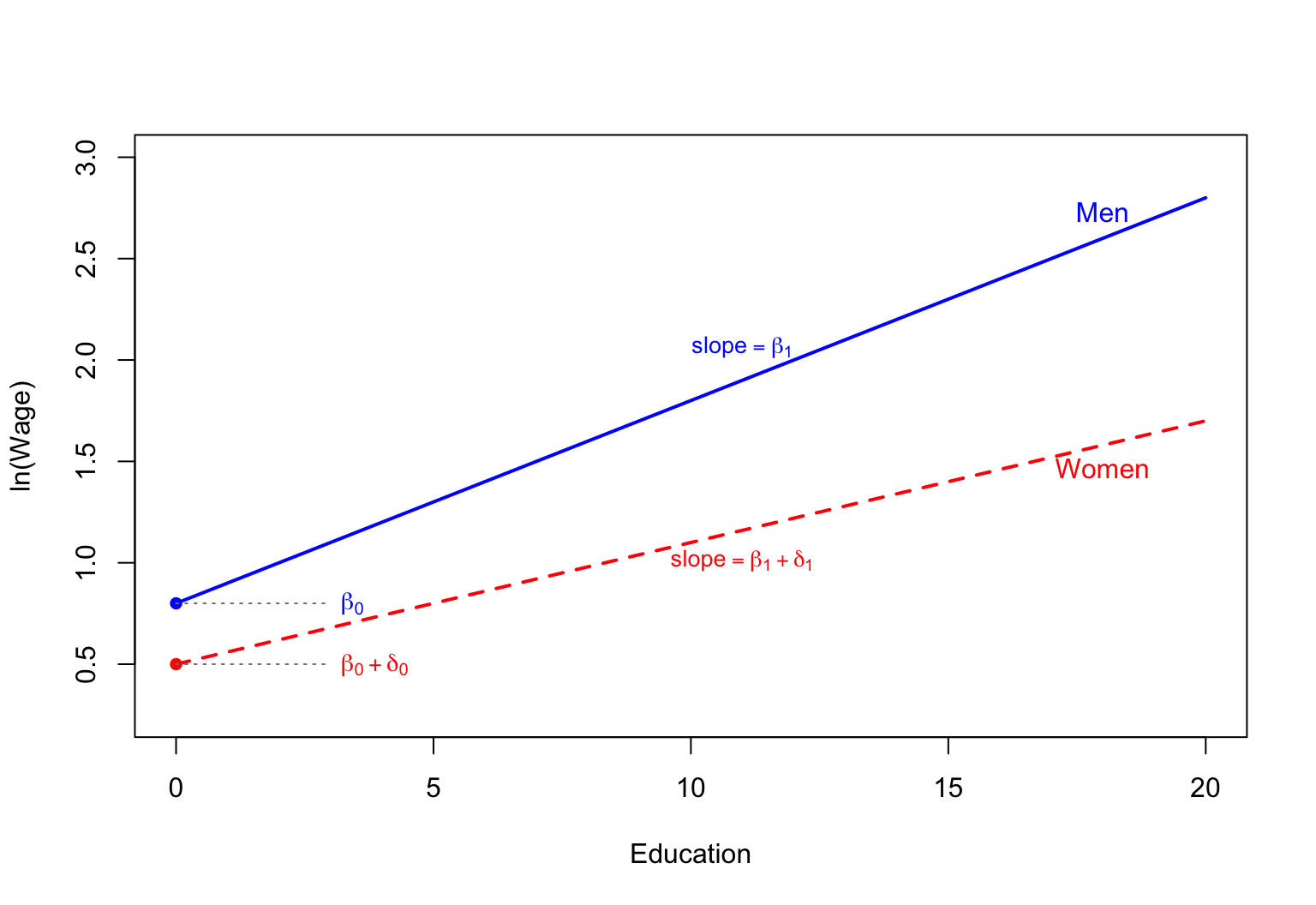 Men are the base group: \ln\left(\text{Wage}_{i}\right)=\beta_{0}+\delta_{0}\text{Female}_{i}+\beta_{1}\text{Educ}_{i}+\beta_{3}\text{Exper}_{i}+\beta_{4}\text{Tenure}_{i}+U_{i}.
